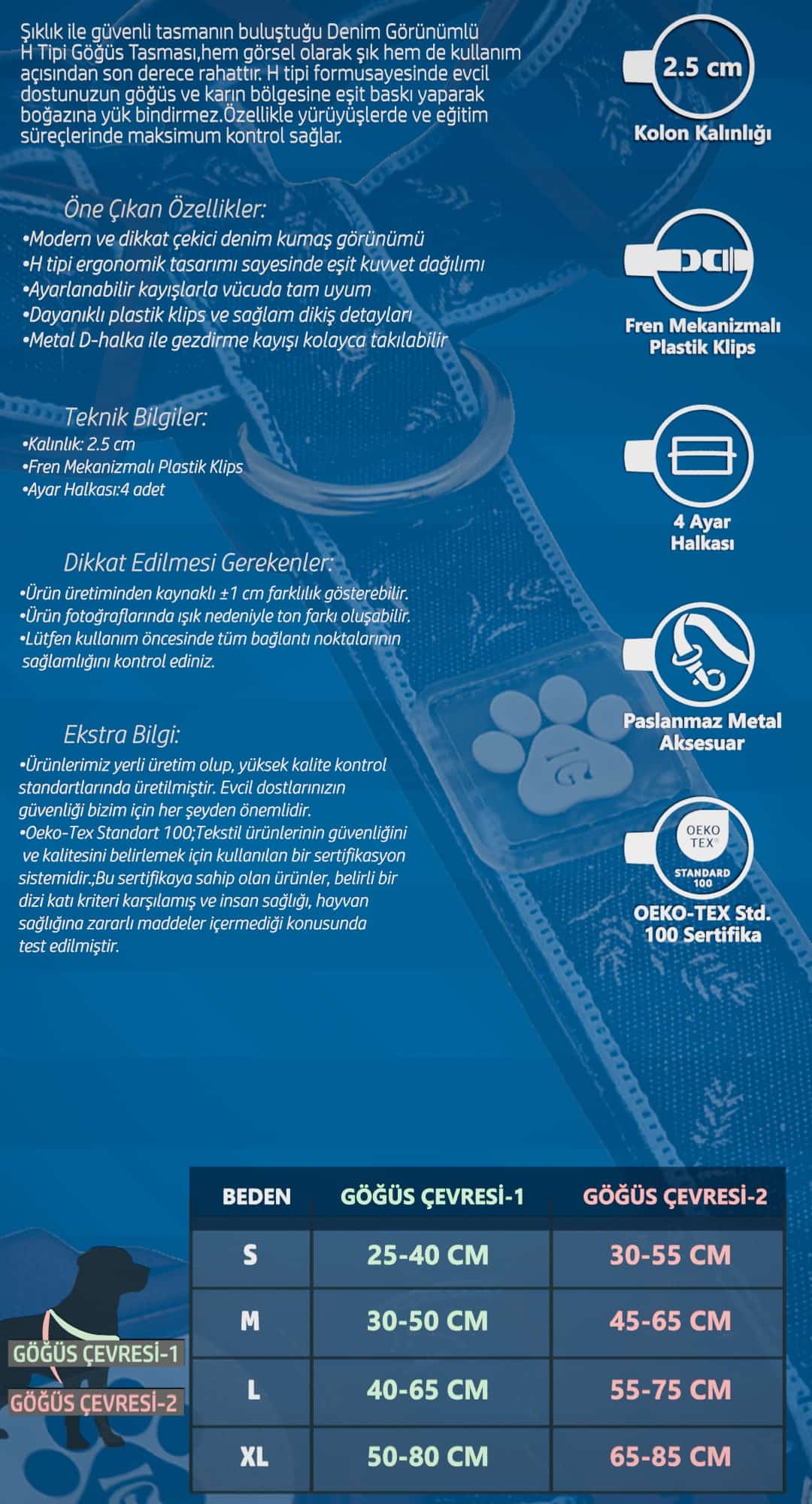 Denim şıklığı ile güvenli tasmanın buluştuğu Denim Görünümlü H Tipi Göğüs Tasması, hem görsel olarak şık hem de kullanım açısından son derece rahattır. H tipi formu sayesinde evcil dostunuzun göğüs ve karın bölgesine eşit baskı yaparak boğazına yük bindirmez. Özellikle yürüyüşlerde ve eğitim süreçlerinde maksimum kontrol sağlar.